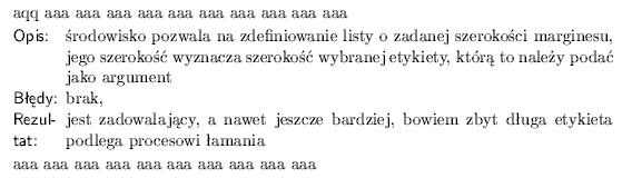 Opisywana lista nie ma zdefiniowanej domy�lnej etykiety, zak�ada si�, �e ka�da pozycja jest opatrzona w�asn� etykiet� (parametr polecenie \item). Standardow� posta� trudno uzna� za zadowalaj�c�, poni�sza struktura