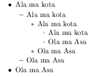 | etykieta | \def\labelitemi{\m@th\bullet}} | \def\labelitemii{\bfseries --} | \def\labelitemiii{\m@th\ast} | \def\labelitemiv{\m@th\cdot} |